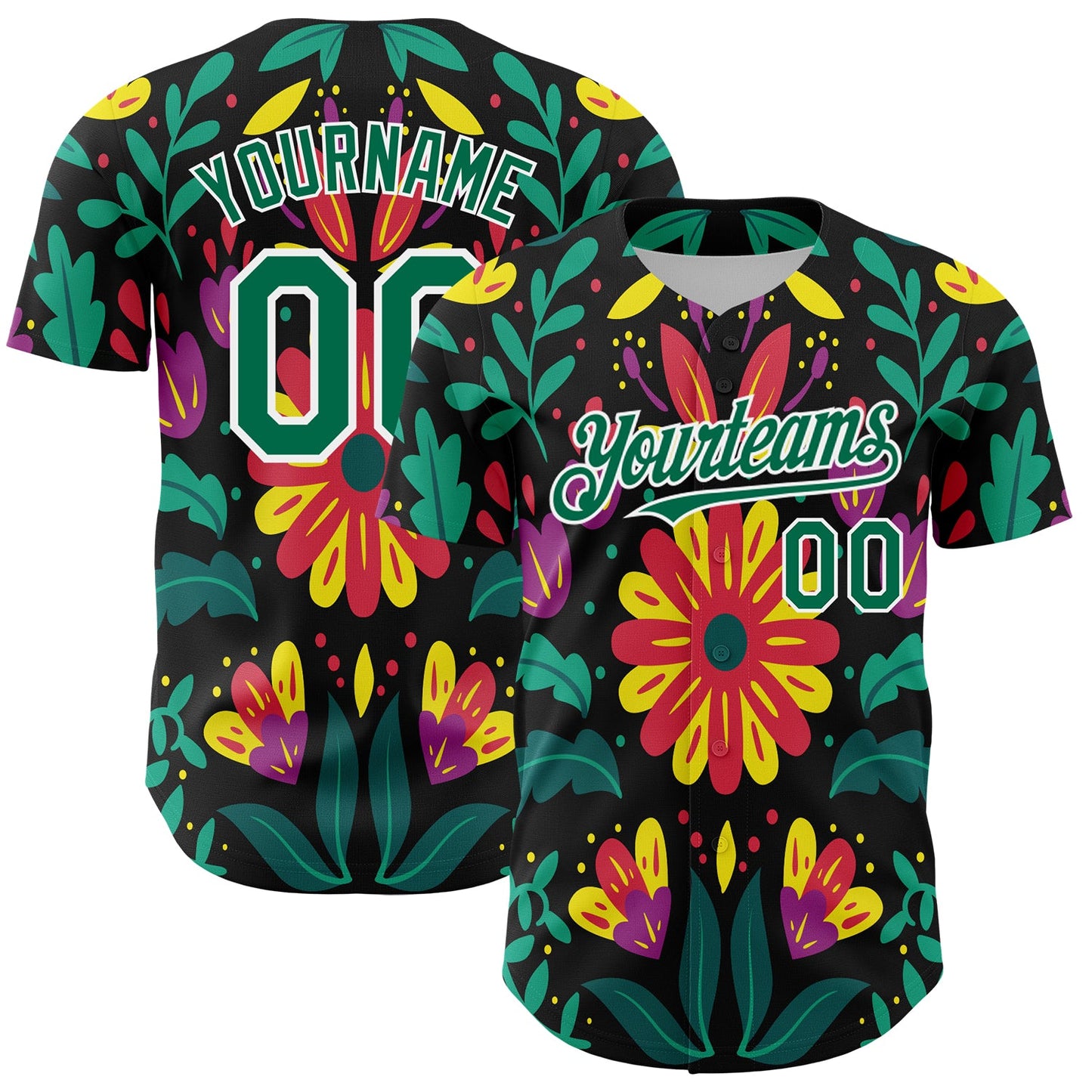Custom Black Kelly Green-White 3D Mexican Festival Flower Cinco de Mayo Authentic Baseball Jersey