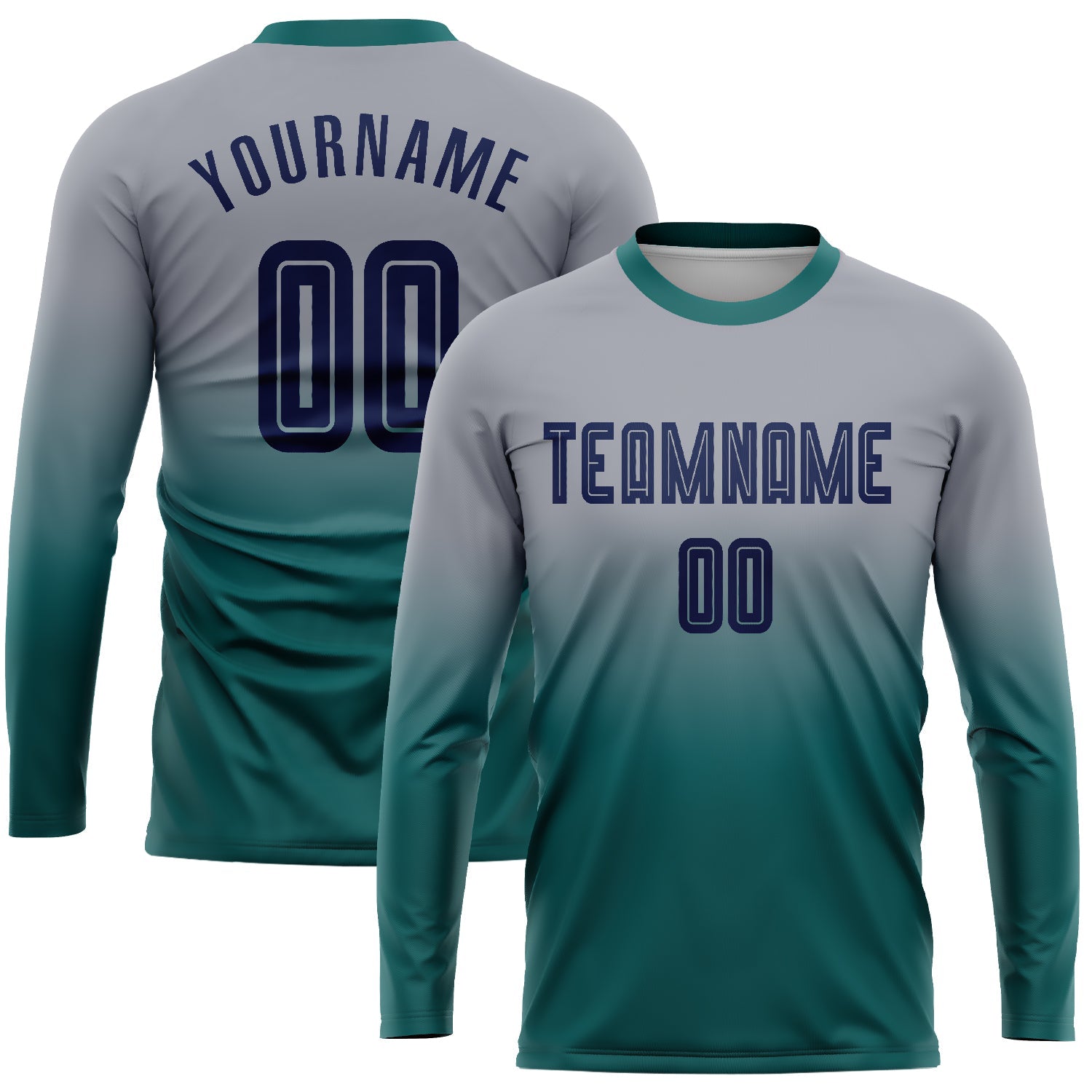 Custom Gray Navy-Teal Sublimation Long Sleeve Fade Fashion Soccer Uniform Jersey