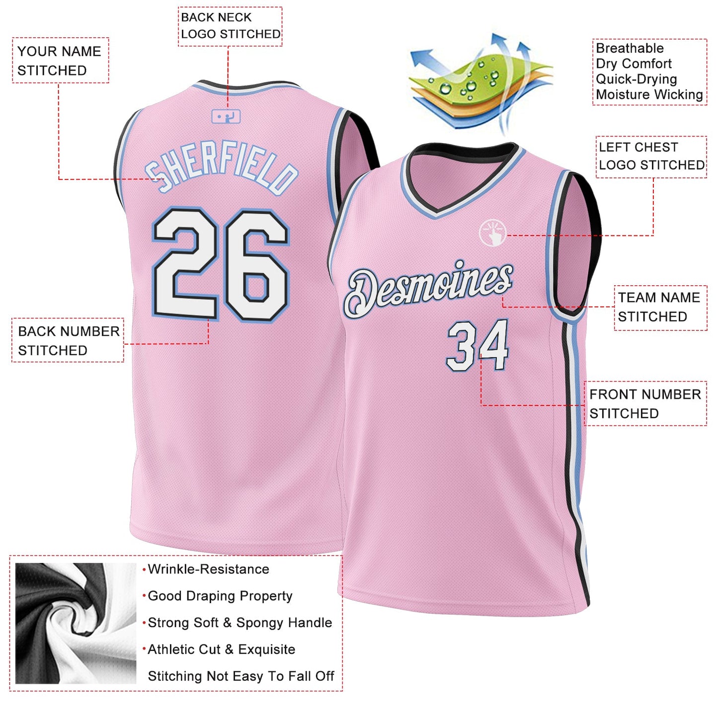 Custom Light Pink Black-Light Blue Authentic Throwback Basketball Jersey